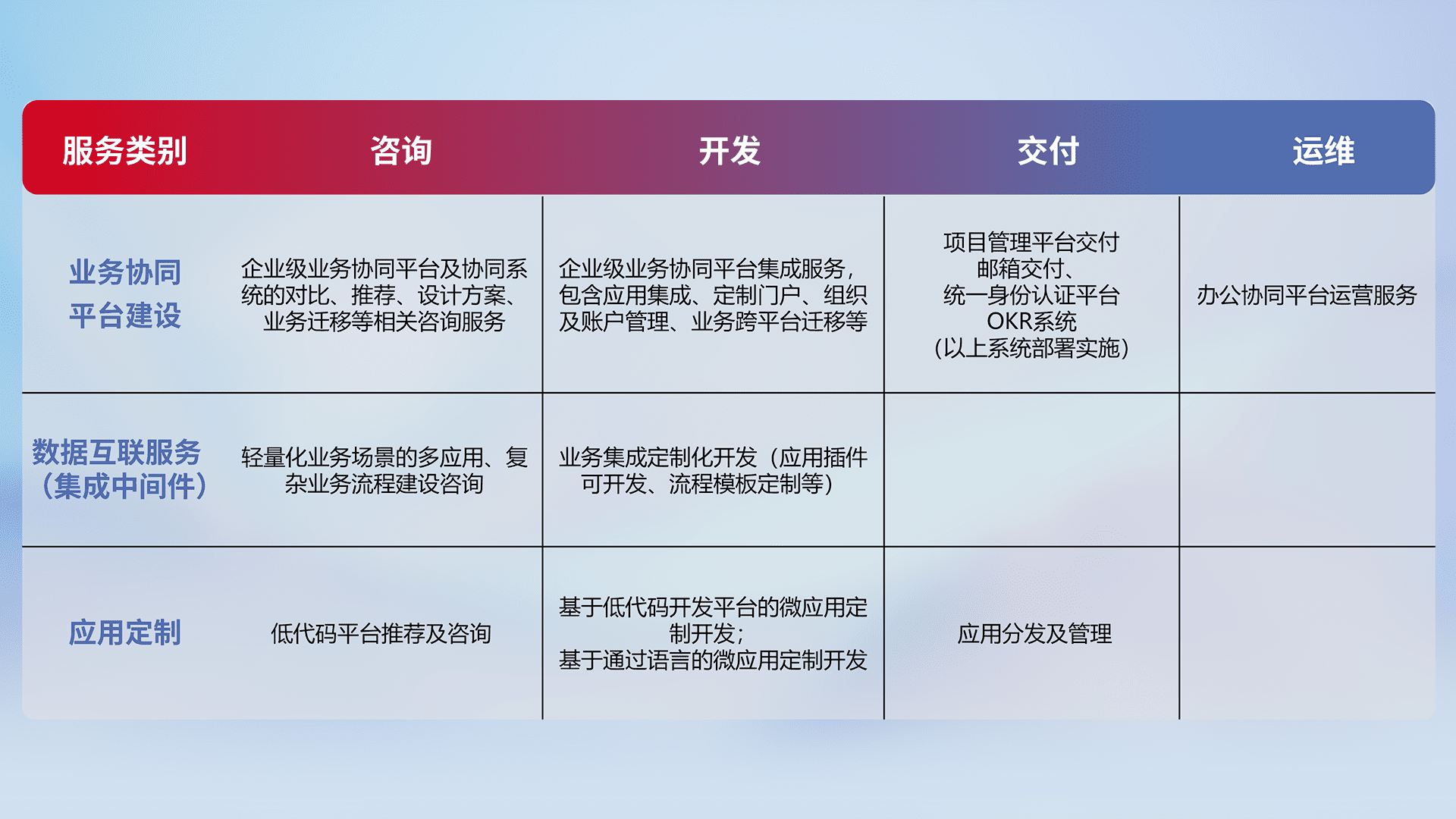 针对钉钉、、、、企微、、、IDaas等平台级产品提供产品的规划、、方案、、、交付、、、、定制化开发等服务,,,实现如统一协同办公、、、、智能客户服务、、混合会议管理、、、、智能数据查询、、、、等业务场景,,,,实现数字化转型。。。。
